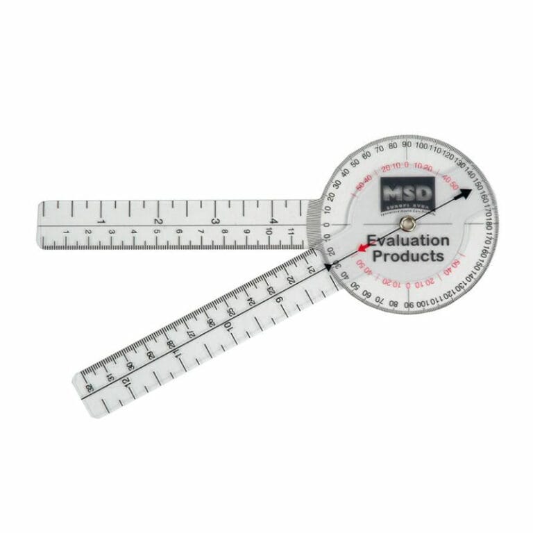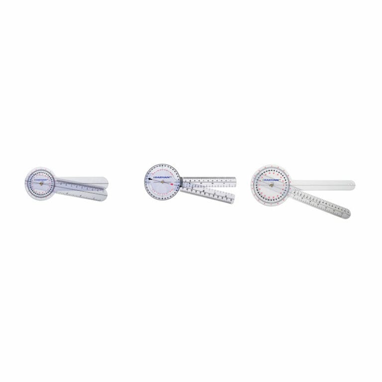 Το πλαστικό γωνιόμετρο επιτρέπει την παρατήρηση του άξονα κίνησης των αρθρώσεων και της εμβέλειας της κίνησης τους. Φέρει δυνατότητα περιστροφής 360ο και τρεις (3) σκάλες μέτρησης.